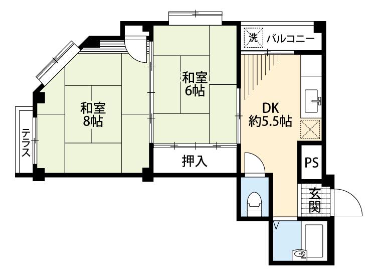 間取り詳細 | 洋室 8畳 、和室 6畳 、DK 5.5畳 |
