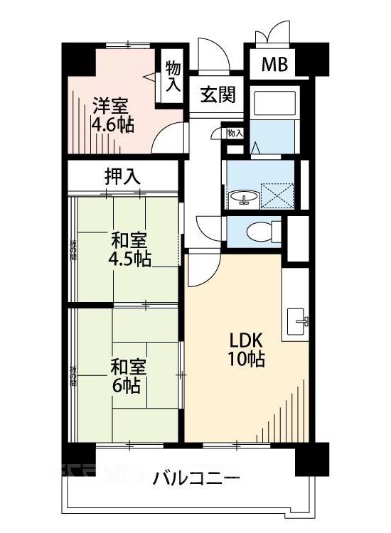 | 間取り詳細 | LDK 10畳 、和室 6畳 、和室 4.5畳 、洋室 4.6畳 |