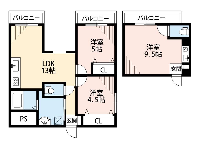 | 間取り詳細 | LDK 13畳 、洋室 9.5畳 、洋室 5畳 、洋室 4.5畳 |