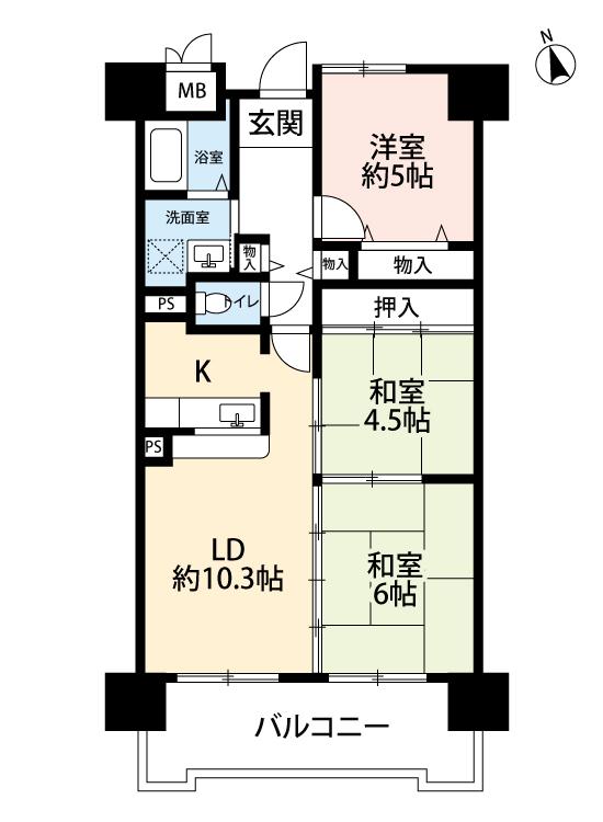 | 間取り詳細 | LDK 10.3畳 、和室 6畳 、洋室 5.1畳 、洋室 5畳 |
