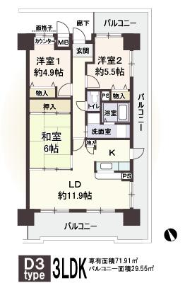 | 間取り | 3LDK | 専有面積 | 71.91㎡ |