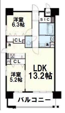 | 間取り詳細 | LDK 13.2畳 、洋室 6.3畳 、洋室 5.2畳 |