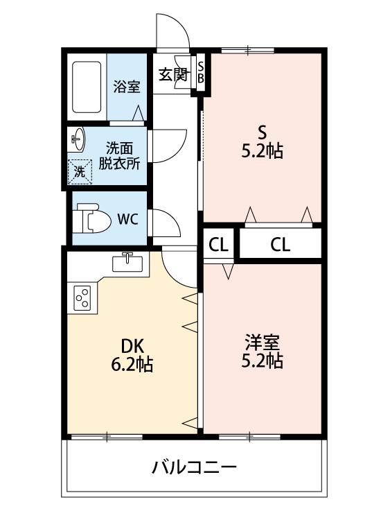 | 間取り詳細 | 洋室 5.2畳 、S 5.2畳 、DK 6.2畳 |